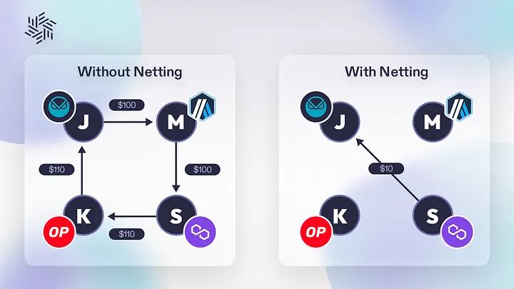 净额结算(Netting):净额结算是指聚合和抵消多笔交易,以尽量减少实际的资金流动。例如,如果有100美元从链A流向链B,同时有80美元从链B流向链A,那么在净额结算后,实际上只需要从链A到链B转移20美元。