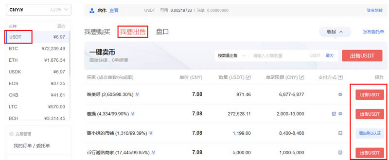 3、选择一个买家 点击后面的出售USDT。