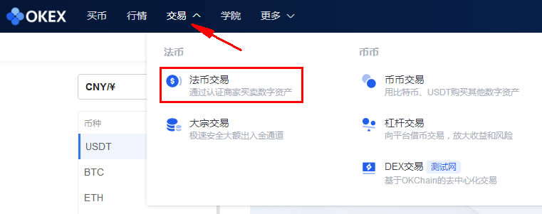 1、登录OKEX账号,点击顶部的 交易 — 法币交易