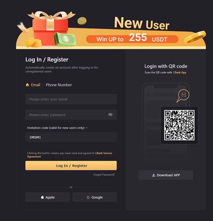 您首先需要在 Lbank 交易所注册 发邮件至 一个 密码 访问。然后您将按登录/注册。
