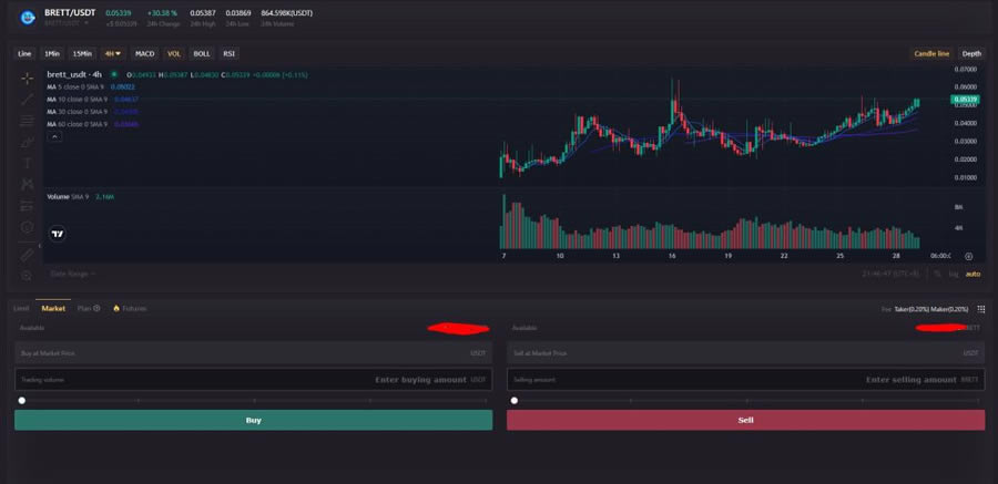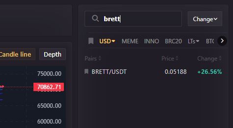 发送后 USDT 您将点击类别 贸易/现货交易 在搜索中你会写下它 布雷特 你会继续 布雷特/USDT 把你放在代币图表上。