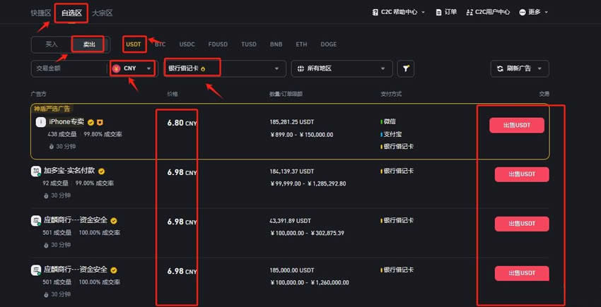 9、根据提示选择“自选区”——“卖出”——“CNY”可以点击所有支付方式筛选支付方式,而后点击“出售USDT”即可
