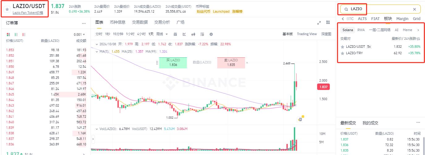 8、在右上角搜索框搜索LAZIO,选择LAZIO/USDT交易对,可以看到LAZIO实时行情