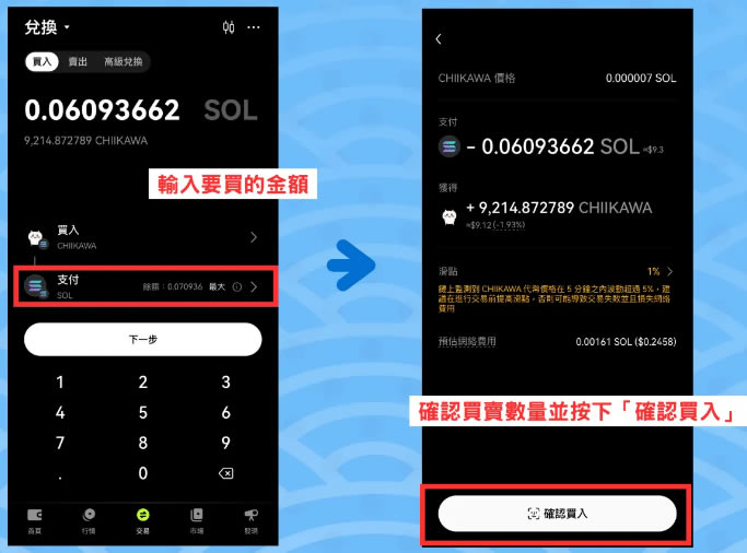 确认完要买的币之后,再来就是确认你想要购买的吉伊卡哇$Chiikawa 币数量。