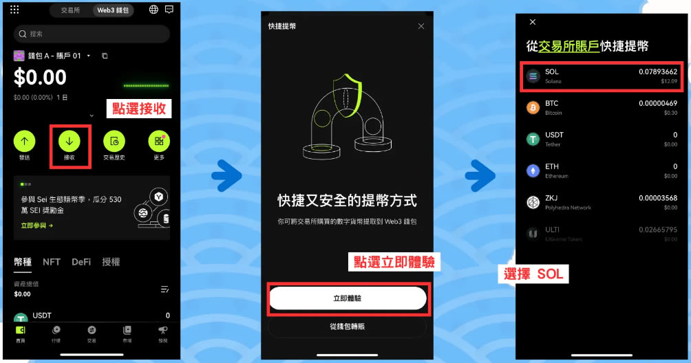 - 从OKX 交易所存入刚刚买的SOL 币到Web3 钱包