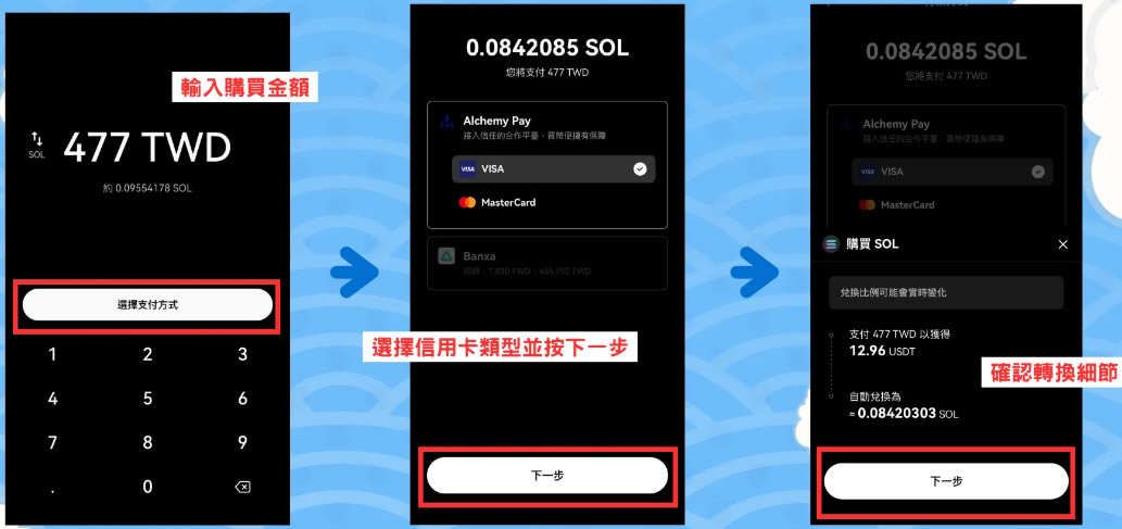 接着,你要输入想要买的台币金额,就会以当下的汇率去换算币值,像下方显示477**币可以兑换大概0.09554178 SOL。