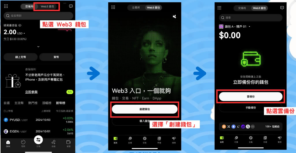 - 在OKX App 点击Web3 钱包创建,并进行云备份