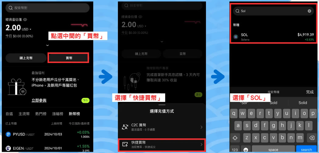 首先先进入欧易OKX App 后,点选中间的「买币」选单,选择「快捷买币」,输入「SOL」并选择跳出来的SOL 币。