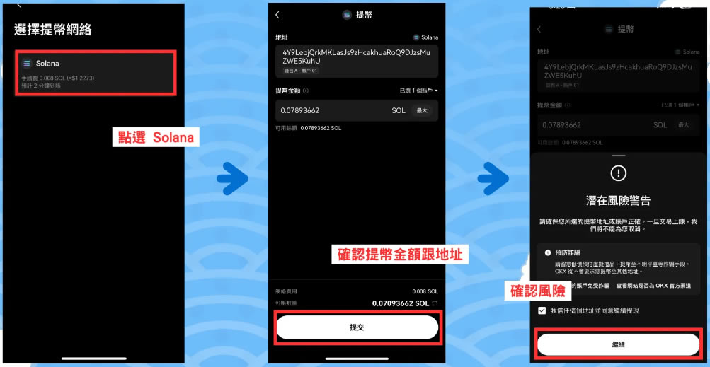点下去之后,他会问你要选哪一个提币网路,目前只有Solana,直接选这个。