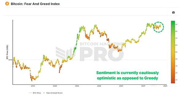 恐惧和贪婪指数处于 70 左右的 “贪婪” 水平,虽离极端贪婪尚有距离,但在历史上被视为积极信号。去年该指数处于类似水平时,比特币价格为 34,000 美元,之后数月翻倍增长,为当前市场带来积极预期。