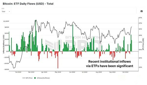 除了技术指标之外,宏观环境也越来越有利于比特币。机构资金继续流入比特币交易所交易基金(ETF)。过去几天,已有超过 10 亿美元流入比特币 ETF,反映出人们对该资产的信心不断增强。在过去的几周里,我们看到 ETF 资金流入增加了数亿美元,这表明聪明的资金,特别是机构投资者,看好比特币的未来。