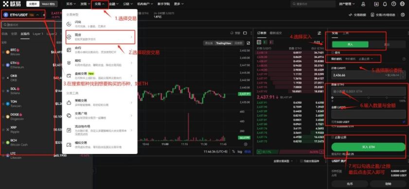在“交易”页面选择交易对,如ETH/USDT。查看实时交易价格、成交量等信息。