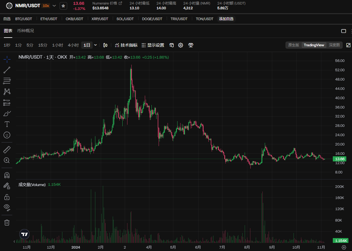 NMR币从今年3月涨到50多美金开始下跌到今天的13多美金,现在走势也是缓慢下跌,目前看不到未来涨势,即使进入11月份的比特币暴涨值7.3万美金的时候,也没跟上行情,一路下跌。