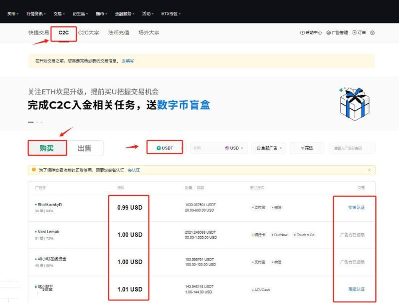 2、进行身份认证后,可在“买币”——“快捷交易”——“C2C”处进行交易,注意法币选择“CNY”,选择好商家进行交易即可