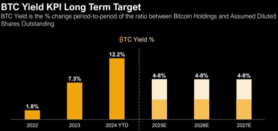 公司使用比特币收益率作为关键绩效指标,以帮助评估其以公司认为对股东有利的方式收购比特币策略的绩效。微策略认为,该KPI可用于补充投资者对其通过发行额外普通股或可转换为普通股的工具,来帮助投资者对于购买比特币的理解和决定。