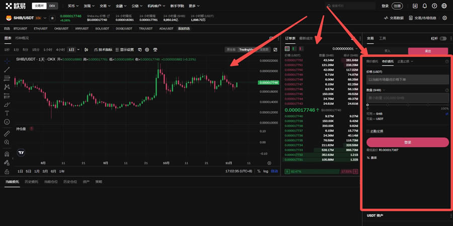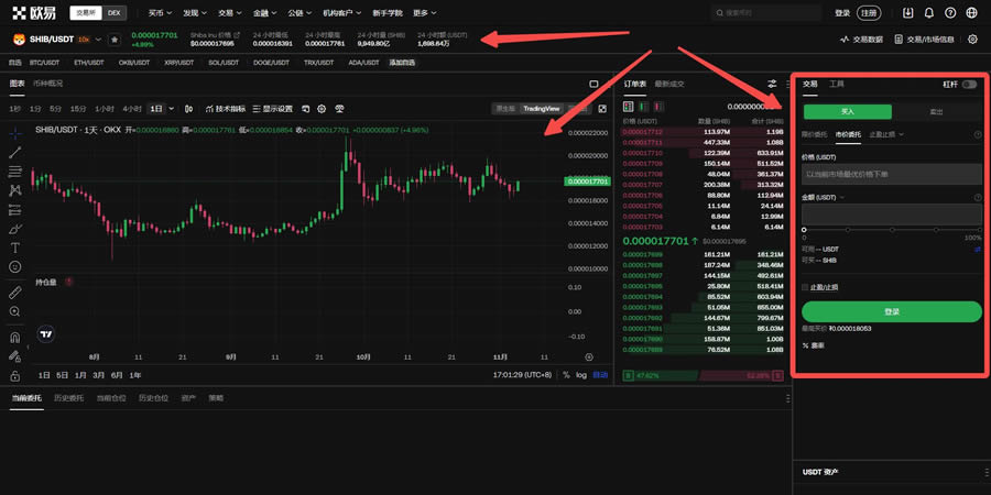 选择屎币交易对:选择左上角【交易】-【现货】-搜索栏中输入【shib】查询交易对,点击进入。