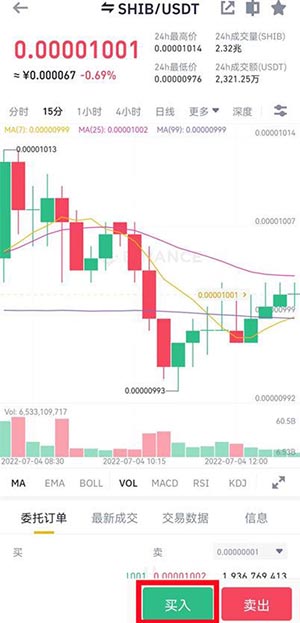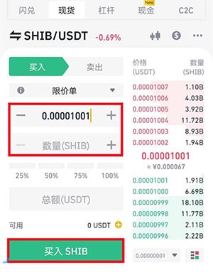 9、选择SHIB/USDT交易对,点击买入。