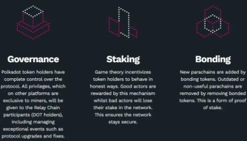 DOT 币是波卡链的治理代币,持有DOT 可以参与提案的决议,例如决定网络费用、增加或移除平行链等。