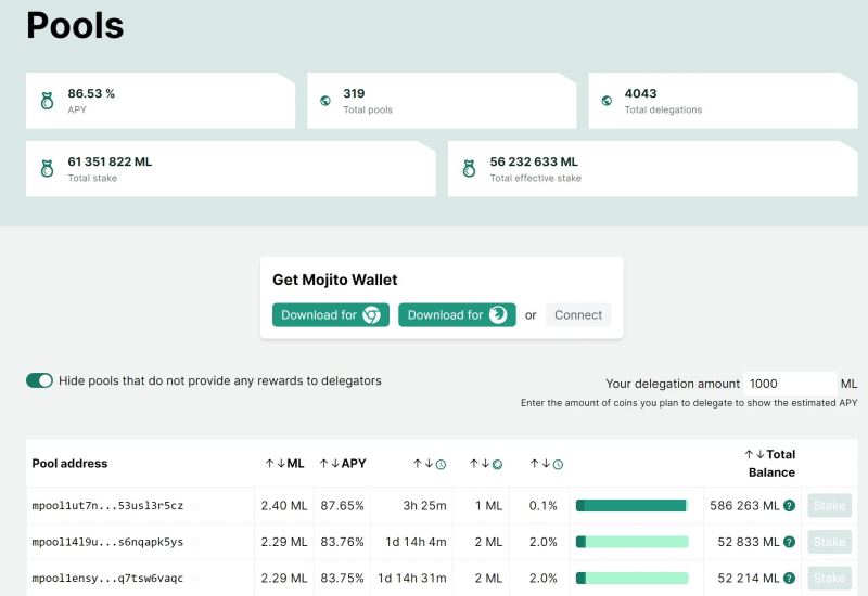 ML 持有者可以通过质押来发挥他们的$ML 作用,这允许参与者为网络安全做出贡献,同时赚取奖励。目前高达 88% 的年化收益率(APY)使质押对代币持有者具有吸引力。