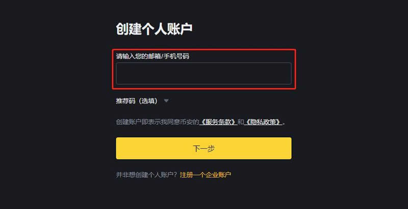 2、币安已全面开放大陆用户进行手机号注册,输入邮箱/手机号、点击下一步即可