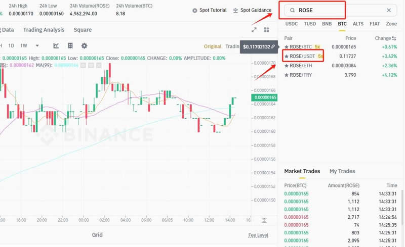 8、搜索币种简称【ROSE】,选择【ROSE/USDT】交易对
