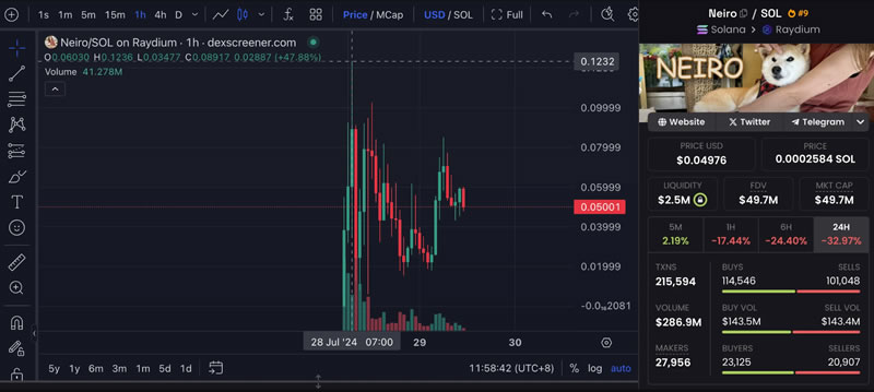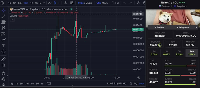 Solana 生态的第一个 Neiro 代币合约部署于凌晨 5 点之后,可以说是反应最快的“Meme 币项目”。截止撰稿时,代币价格为 0.049 美元左右,市值为 4970 万美元,高点价格一度突破 0.12 美元。