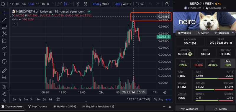 以太坊生态的 NEIRO 代币合约部署于昨天凌晨 6 点 30 分左右。截止撰稿时,代币价格为 0.013 美元左右,市值为 1310 万美元,高点价格一度突破 0.018 美元,达 0.0188 美元左右。
