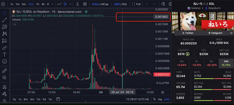 基于 pump.fun 平台发布的 Solana 生态 Meme 币 ねいろ(日语直译为音色)也被视为新柴犬的象征符号。截止撰稿时,代币价格为 0.00023 美元左右,市值为 23.3 万美元,高点价格曾一度拉升突破至 0.0018 美元,目前已大幅回落,但有不少人因其“更原汁原味”而采取了埋伏操作。