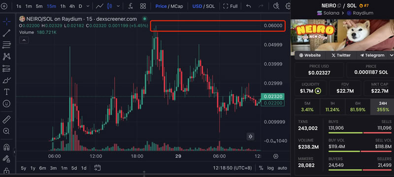 Solana 生态的第一个 NEIRO 代币合约部署于凌晨 5 点 15 分左右。截止撰稿时,代币价格为 0.023 美元左右,市值为 2270 万美元,高点价格一度接近 0.06 美元。