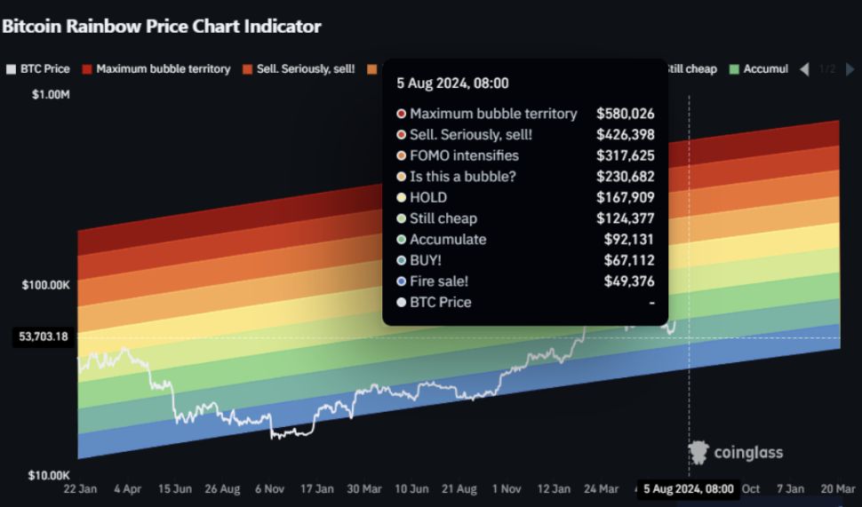 当价格跌至较冷颜色区域时,整体市场情绪通常较低迷,许多投资者对比特币兴趣减少。彩虹图指出,这些时期通常是策略投资者增持比特币的绝佳时机。