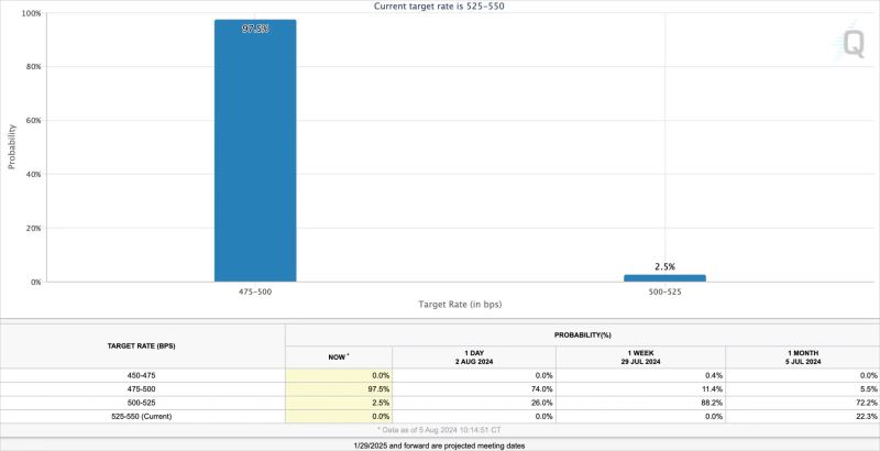 联邦基金期货市场已经将激进的应对措施纳入定价。一周前,美联储主席 Jerome Powell 还在淡化今年降息的必要性,市场预计美联储 9 月会议降息 50 个基点的可能性仅为 11%。如今,市场将这一可能性提高到了 98%。一些人甚至呼吁在 9 月会议前「紧急降息」。