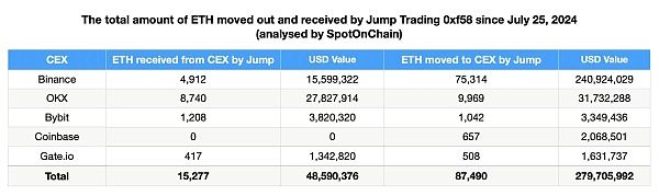 在过去的10天内,链上数据Spot On Chain显示,自7月25日开始,被标记为Jump Crypto钱包向CEX交易所充值了累计价值为2.79亿美元的ETH。