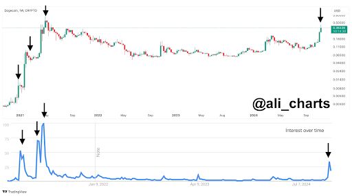 根据加密货币分析师阿里·马丁内斯在社交媒体平台X上强调了这一趋势,狗狗币的受欢迎程度甚至还没有达到顶峰。这位分析师分享了一张图表,描绘了社交媒体对狗狗币的兴趣随时间的变化。尽管最近的反弹导致了兴趣的峰值,但它还没有达到2021年的兴趣。考虑到这一点,Martinez强调道,狗狗币的价格在这个周期内有更大的增长空间。