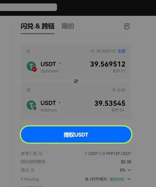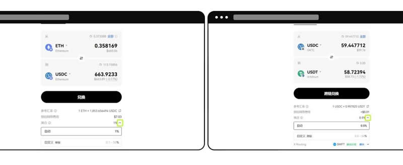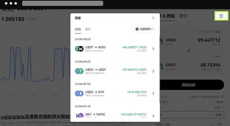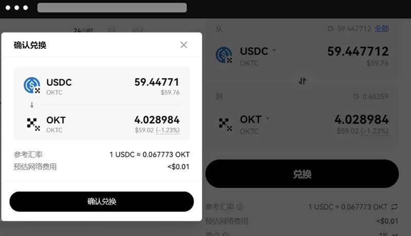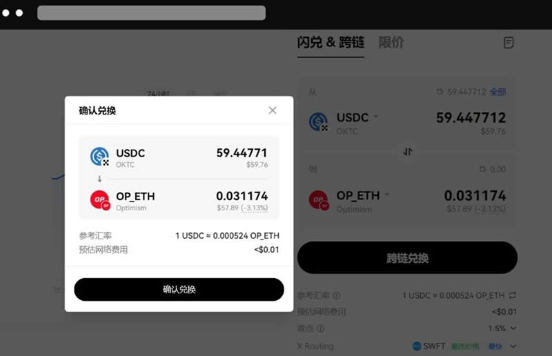 4、跨链兑换指的是不同公链之间的资产转换,即支付和接收币种所在网络不同,如将OKTC上的USDC和Optimism上的ETH进行兑换。输入想兑换的数量,点击兑换后,在钱包内确认,等待交易上链。