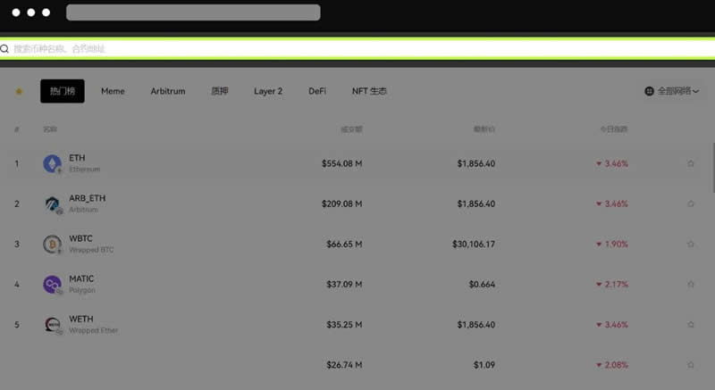 1、打开OKX官网(点击注册),切换至Web3钱包,点击连接钱包,输入密码并登录。目前支持OKX钱包、MetaMask等钱包直接连接,也支持通过WalletConnect连接。如果没有钱包,可以下载OKX插件钱包。然后查看币种,即点击交易,进入闪兑&跨链页面,点击页面右侧搜索框,展开行情模块,可关注热门榜、Layer2、DeFi等不同类型的币种交易价格、涨跌幅、交易量,点击某一币种即可交易。