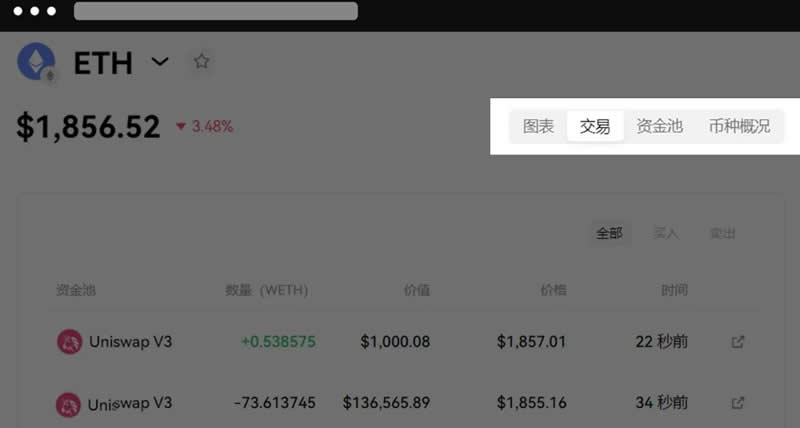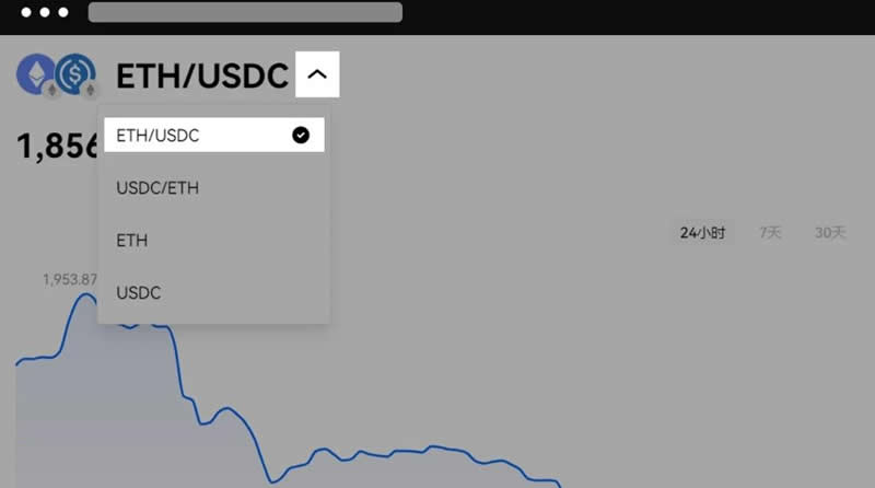 2、查看价格走势,选择支付和接收币种,如ETH和USDC,就能在左侧看到相关代币的K线图和币种概况,默认展示支付代币/接收代币的兑换比例。点击∨,出现ETH/USDC、USDC/ETH、ETH、USDC。点击单个币种,如ETH,进入该币种详情页,会显示图表、交易、资金池和币种概况。