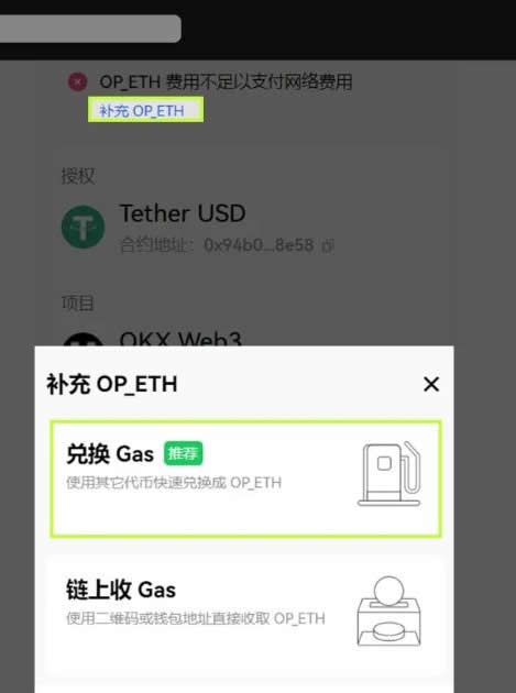 6、另外,OKXDEX上线了兑换Gas功能,可以将USDT、USDC、DAI、WETH等主流资产迅速兑换成Gas费,帮助你解决在实际交易中没有Gas费或Gas费不足的问题。