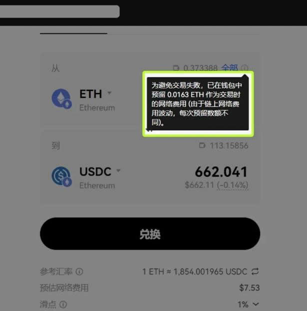 7、用户使用主网原生代币进行兑换时,在选择兑换数量时点击全部后会将会自动预留部分代币作为gas费以避免交易失败。