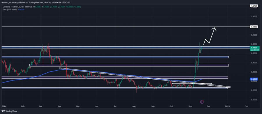从基本面看,随着比特币(BTC)达到94,000 美元的里程碑,进一步激发了加密货币爱好者的乐观情绪,因此,ADA 币可能会追随比特币、瑞波币等顶级加密货币的势头,飙升30 % 以上。