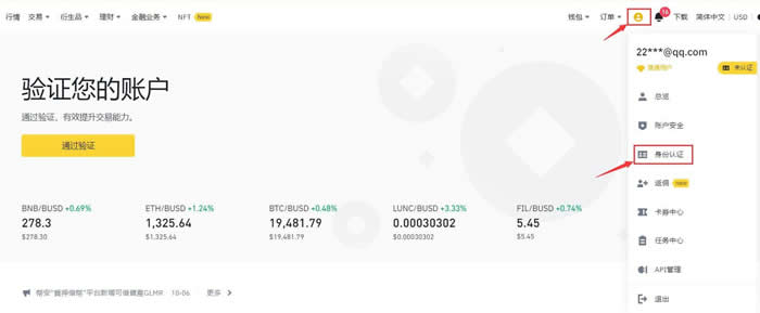 4.登录币安账户,在首页【用户中心】--【身份认证】进行身份认证,在该页面可以查看当前认证级别,它决定了您的账户在币安的交易限额。如需提升额度,请依次完成各个级别的身份认证。