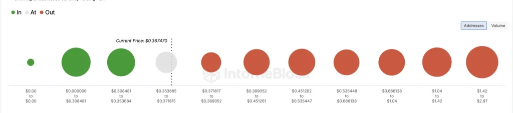 IntoTheBlock 数据显示, 0.35 美元左右的地址和交易量高于0.66 美元之前的几个价格范围的地址和交易量。因此, Cardano 的价格有可能达到这一点。然而, 1.04 美元的供应墙造成了巨大的阻力,这可能使ADA 难以突破该水平。
