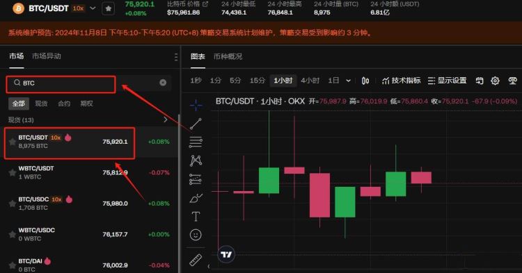 8、在搜索框输入BTC,选择BTC/USDT交易对,可以看到BTC实时行情