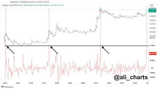 根据马丁内斯,狗狗币目前的轨迹反映了抛物线牛市的开始阶段。他的乐观情绪受到许多因素的推动,包括大量的鲸鱼活动、零售投资者日益增长的兴趣以及指向大幅增长的历史价格模式。