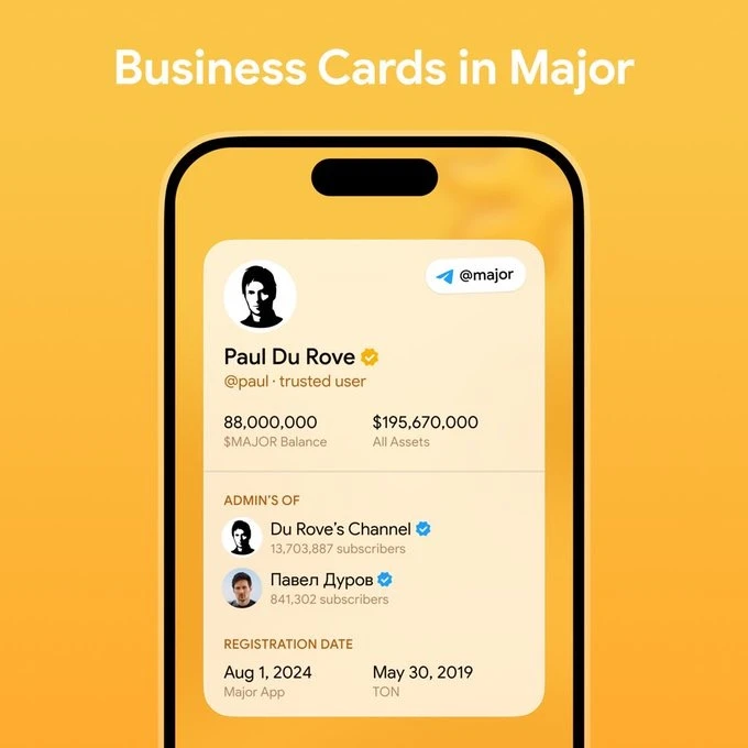 Major 计划未来推出一项创新功能——Telegram 名片。用户将能够将自己的 Major 个人资料转换为经验证的 Telegram 名片,方便在 Telegram 和 TON 生态系统中快速分享。该名片将展示用户在 Major 中的余额(如 MAJOR 代币和其他代币)、用户拥有的频道、注册日期以及钱包注册日期。此外,Major 还将在平台内引入钱包验证系统,以提高安全性和透明度。