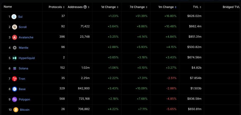 如上图所示,如果将 Sui 生态在 2024 年的 TVL 波动趋势与其他主流 Layer 1/Layer 2 进行对比,不难看出 Sui 的增长态势也是最为强劲的。在所有 TVL 超过 5 亿美元的主流网络中,Sui 生态在过去一个月内的增幅高居榜首,远远好于其他多个热门网络。