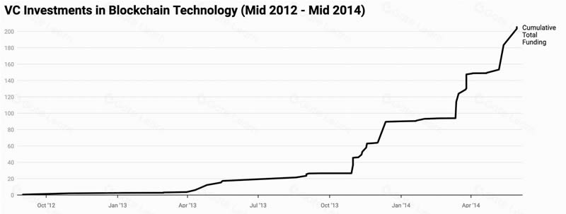 2014年6月,区块链行业的投资额超过了2013年的总额,达到3.14亿美元,比2013年的9380万美元增长了3.3倍。