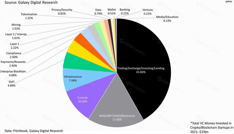 在风险投资家向加密货币和区块链初创生态系统投资的 338 亿美元中,最大部分流向了提供交易、投资、交换和借贷服务的公司,这些公司获得了超过 138 亿美元(41.83%)。越来越多的风险资本投资于Web3公司,包括开发NFT、DAO和Metaverse工具、基础设施和游戏的公司,占总投资的17%。