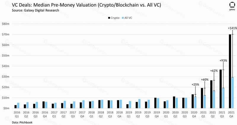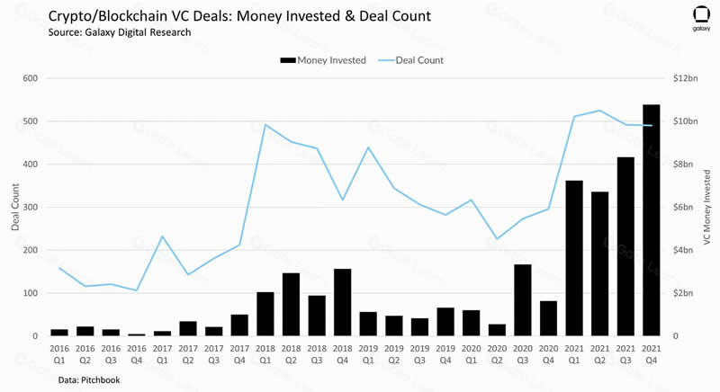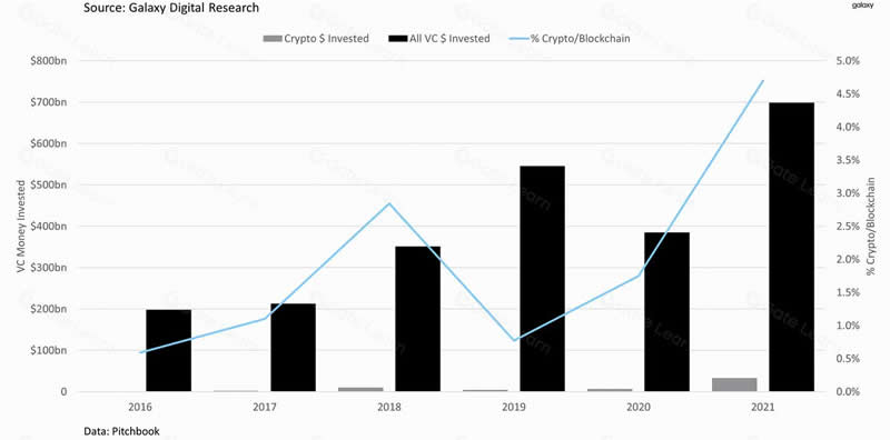根据Galaxy统计数据,2021年全球有近500家区块链风险投资机构,无论是数量还是资金规模均达到历史新高。摩根士丹利(Morgan Stanley)、老虎环球基金(Tiger Global)、红杉资本(Sequoia Capital)、三星(Samsung)和高盛(Goldman Sachs)等主要机构通过后期股权投资进入了区块链市场,为市场注入了大量资金。