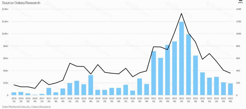 加密风投投资大幅下降,仅达到前两年投资额的三分之一。