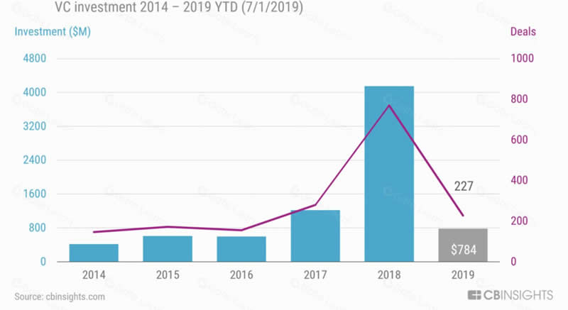 在2016年,由于金融科技投资减少,加密市场的风险投资也出现下降。根据CB Insights的数据,比特币和区块链初创公司的投资比2015年下降了27%,回到了2014年的水平。